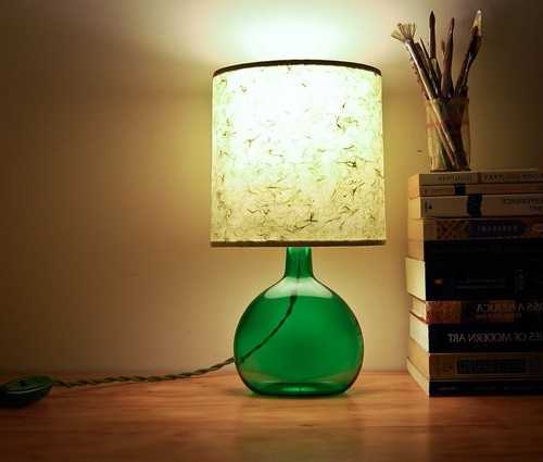 Люстра из стеклянных бутылокДля того чтобы сделать настольную лампу своими руками вам понадобиться абажур достаточно устойчивая стеклянная бутылка. Абажур можно взять как готовый, так и сделать его самому из проволочного каркаса и ткани или картона. Для начала в бутылке необходимо просверлить небольшое отверстие в нижней части бутылки. Затем следует протянуть через получившееся отверстие протянуть шнур электропитания. На горлышке бутылки нужно закрепить патрон и присоединить его к проводу. Осталось лишь ввинтить лампочку установить абажур.