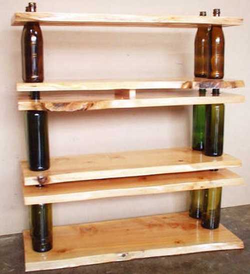 При желании из стеклянных бутылок и листов фанеры или ДСП можно соорудить необычную книжную полку-этажерку. Для этого нужно вырезать в листах фанеры отверстия одинакового диаметра для того чтобы продеть в них горлышка бутылок. Получится, что основание бутылки находится на нижней полке, а горлышко бутылки продето в верхнюю полку. Такую полку можно использовать для декоративных целей. На ней можно расставить любимые фото в красивых рамках и сувениры.