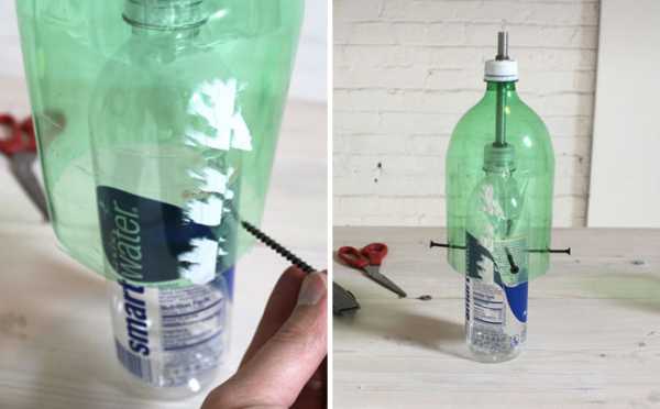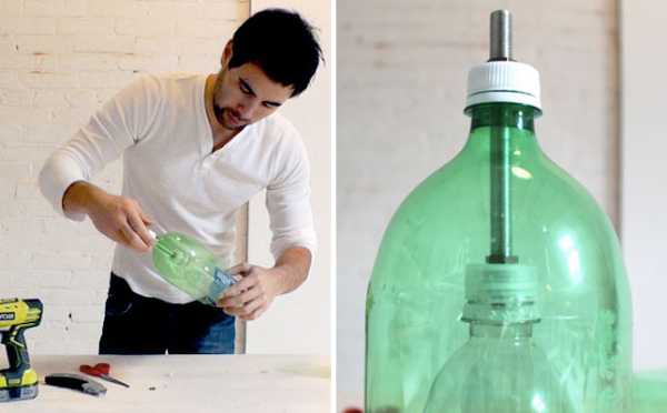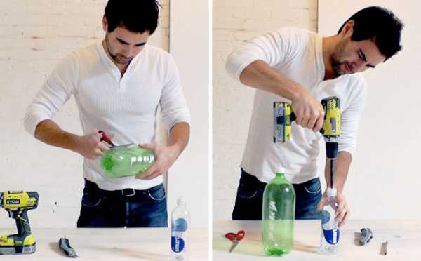 Используйте ножницы, чтобы отрезать дно бутылки. Затем просверлите обе крышки пластиковых бутылок. Отверстие должно быть достаточно большое, чтобы в него прошла трубка с резьбой.