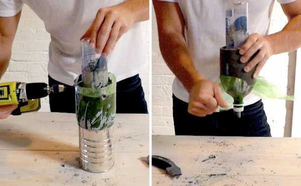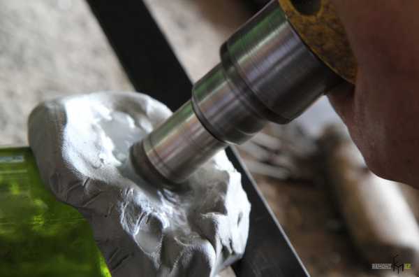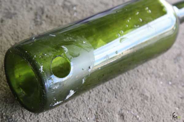 Сверлить нужно медленно и осторожно. После того как процесс сверления закончен, снимаем глину и очищаем бутылку.