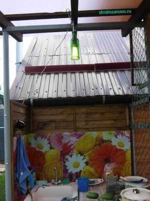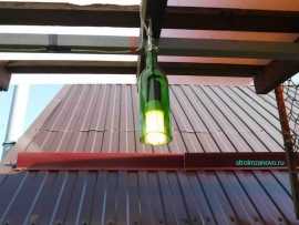 Удобный и практичный светильник для освещения дачного крылечка или беседки для чаепития можно изготовить довольно просто и быстро из завалявшихся красивых бутылок от благородного алкоголя. Для экономичности лучше использовать энергосберегающие лампы.