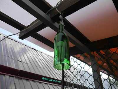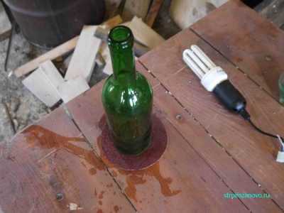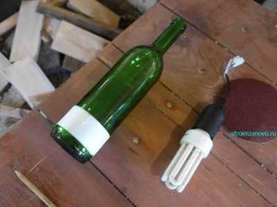 Сложная на первый взгляд задача решается всего за несколько минут. Достаточно знать маленький секрет: чтобы ровно срезать бутылку по строго обозначенному контуру нужно лишь намотать в месте среза пропитанную в бензине или керосине веревку. Саму бутылку нужно наполнить холодной водой по уровень, обозначенный обмотанной снаружи веревкой. Остается лишь поджечь веревку: она в процессе горения нагреет стекло, которое лопнет, образуя ровный и острый срез. Финальный штрих – отшлифовка острой кромки бутылки. Плафон готов, через его горлышко можно уже протягивать электрошнур и устанавливать патрон под лампочку.