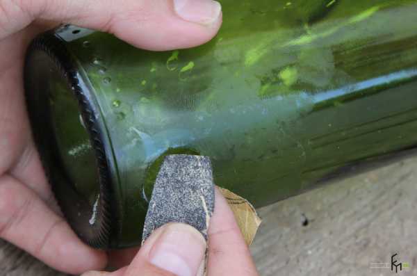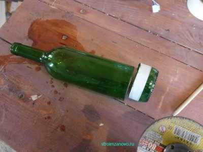 Другой способ требует наличие жесткой фиксации и стеклореза. Сначала с помощью стеклореза делают замкнутую линию среза. При этом стеклорез плотно прижимают к стеклу, а бутылку, зажатую между брусков, медленно вращают. Когда линия готова, тару погружают в холодную воду несколько выше этой линии, а внутрь через воронку наливают кипяток. Вследствие таких действий стекло в месте насечки лопнет, и дно отвалится. Останется только обработать края наждачной бумагой или бруском. Возможно, желаемый результат получится не сразу, поэтому для начала можно потренироваться на не самых красивых бутылках.