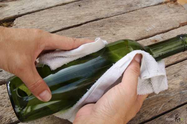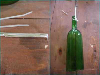 Чтобы аккуратно и безопасно удалить дно у бутылки, нужно обмотать бутылку по линии «отреза» шерстяной ниткой в несколько слоев, затем связав концы снять обмотку для смачивания в ацетоне или уксусе и снова надеть на бутылку. После этого нитку следует поджечь и, поворачивая бутылку, дождаться, когда она прогорит, чтобы немедля опустить бутылку в заранее подготовленный тазик или раковину с холодной водой. Дно с легкостью отпадет, оставив ровный и гладкий край.