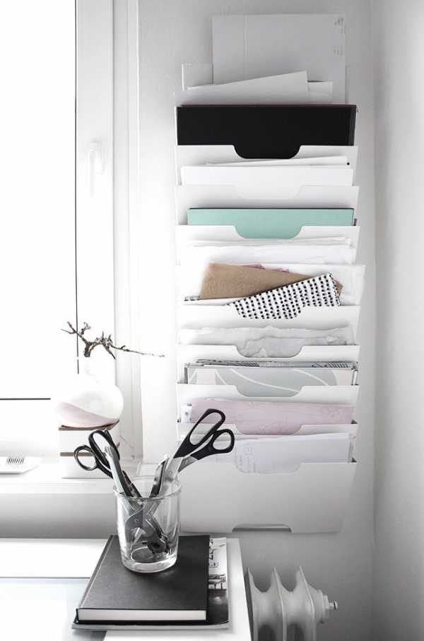 Наконец-то мы добрались до идеального способа хранения бумаг — навесных папок и узких металлических корзин. Жесткая конструкция позволит документам не мяться, а чем больше будет карманов, тем проще будет наводить порядок и поддерживать его.