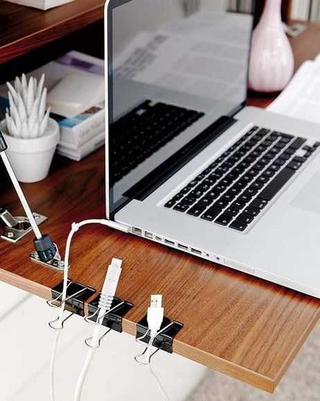 Беспорядок в проводах может сильно портить картину привлекательного места для работы и раздражать не только посторонних, но и вас самих. Кроме того, главное в том, как украсить рабочий стол – это навести порядок, особенно разобраться со шнурами. Простой способ решения проблемы – перевязать провода лентой или проволокой за столом. Можно использовать и другие оригинальные идеи, например, пропустить провода через отверстия в биндерах или использовать бельевые прищепки.