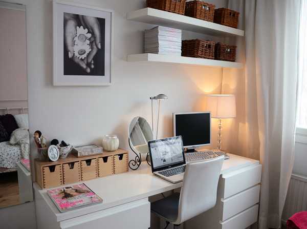 Полка — очевидное решение. Все, что не помещается или мешается на столешнице с удовольствием переедет туда. Можно закрепить на стене несколько полок, тогда верхние, наименее удобные в доступе, могут стать хранилищем архива документов или мини-библиотекой. Если стены сверлить нельзя, вместо обычных полок можно использовать конструкции из поставленных на боковую грань ящиков.