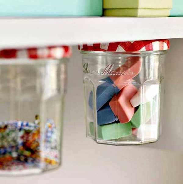 Полки бывают уже со встроенными ящиками, которые расширяют их функциональность. Если ваша полка обычная, вы можете сделать ящичек сами: прикрепите снизу к полке направляющие, а в качестве ящика возьмите любой контейнер с выступающими бортиками. По той же логике полку можно дополнить банками для хранения мелочей: для этого просто приклейте на суперклей крышку банки на нижнюю плоскость полки.