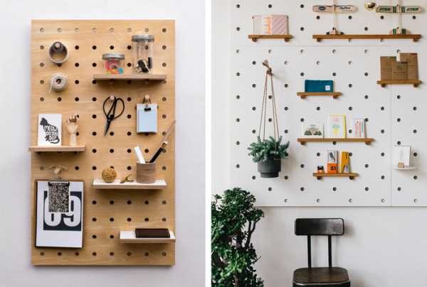Внешне похожа на предыдущую идею: тоже панель с дырочками, только делается из дерева, а отверстия обычно побольше и с большими интервалами. Принцип крепления здесь немного другой: в отверстия вставляются колышки, которые могут служить крючками или опорой для полок.