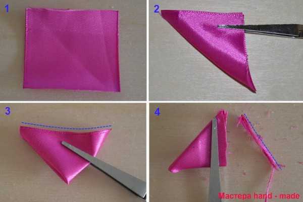 Маленькие цветочки, я делала из ленты шир. 2,5 см. одинарные. На самом деле, лента такой ширины у меня была только белая. А розового и сиреневого цветов, такого оттенка, не было. Поэтому, я просто разрезала ленты шир. 5 см. Из одного квадрата в 5 см. получается — 4-е квадрата в 2,5 см. Разрезала я паяльником, с помощью линейки. Я уже несколько раз писала об этом, посмотреть это можно например в мастер-классе: Свадебное шампанское. Бело-розовые цветочки я сделала только потому, что розовой ленты осталось совсем мало. Всего получилось — 28 шт, по 14-ть, на каждый подхват для штор.