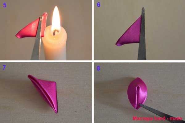 5. Обрезанную сторону поднесла к свечке для того, чтобы лента слегка оплавилась. Совет: оплавлять лучше в районе фитиля (здесь меньше коптит). Пламени если и касалась, то только слегка. Лепесток проводила несколько раз вдоль огня, чтобы оплавился весь край.