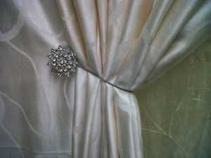 Заколки для ткани из металла, пластика или дерева отличаются от аналогичных аксессуаров для волос только размерами. Они должны соответствовать ткани по плотности. Легким тюлевым гардинам лучше подойдут небольшие изящные заколки, занавескам из плотных тканей придется подобрать крупные изделия. Для тяжелых портьер заколки не подойдут, здесь уместнее металлические держатели или тканевые подхваты «бананы».