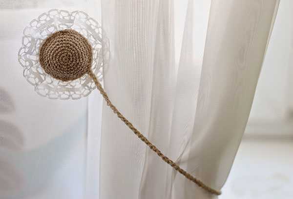 Макраме – популярный вид рукоделия, прикладное искусство, основанное на технике узелкового плетения. Шторы с подхватами, выполненным в технике макраме выглядят очень самобытно, способны присобрать плотную тяжелую ткань, но и на легких занавесках при удачном дизайне смотрятся отлично.