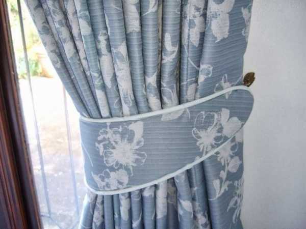 Тканевые держатели приобретают в комплекте вместе с готовыми занавесками или заказывают при их пошиве. Стандартная двусторонняя модель «банан» имеет внутри пластиковую прокладку, благодаря которой держит форму и красиво «обнимает» портьеру. На концах «банана» пробивают блочки или пришивают петли, за которые его вешают на крючок для крепления на стене.
