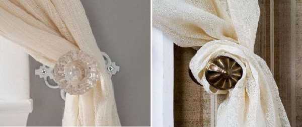 Модели для штор на магнитах идеальный вариант того, как крепить легкие ткани. Магниты в оболочке (от забавных пластмассовых смайликов до полудрагоценных камней) вшиваются на концы прихватов из лент, декоративных тросов или витых шнуров. Самые популярные магниты для штор ― металлические или пластиковые изделия простой геометрической формы (круглые, овальные, ромбовидные), однотонные, с рисунком, украшенные стразами или обтянутые тканью.