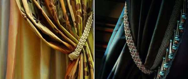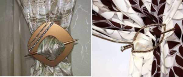 Аксессуары сложной формы, ярких расцветок, украшенные блестящей фурнитурой, подходят для гладкокрашеных занавесок. Для портьер из набивной ткани со сложным рисунком лучше использовать простые подхваты из той же ткани или шнуров с кистями.