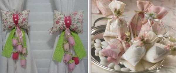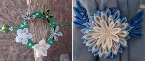 В легком праздничном интерьере можно подхватить шторы изделиями в технике канзаши или из шелковых лент. С помощью нагретой плойки из последних умельцы создают замечательные украшения: от высокой температуры лента начинается завиваться и приобретает необходимую форму.