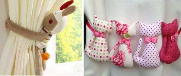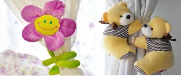 Милые игрушки из фетра или плюша, обнимающие занавески ― идеальное оформление подхватов для штор в детскую. Они могут быть драпировать ткань, удерживая ее длинными, завязанными в узел лапками, хвостом, в который вставлена проволока, пришиваться на полоску для штор из атласной ленты, крепится на магнитные держатели, пуговицы.