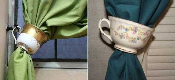 Стильные держатели для штор на кухню получаются из обычных столовых приборов: вилок, ложек, чашек. Для их изготовления достаточно изогнуть вилку или ложку и прикрепить их на стену, а у чашек вырезать дно и повесить их за ручки на крючки, закрепленные на стене. Металлические приборы в состоянии удержать плотные портьеры. Фарфоровые и фаянсовые чашки смогут удержать только тюль с легкими занавесками.