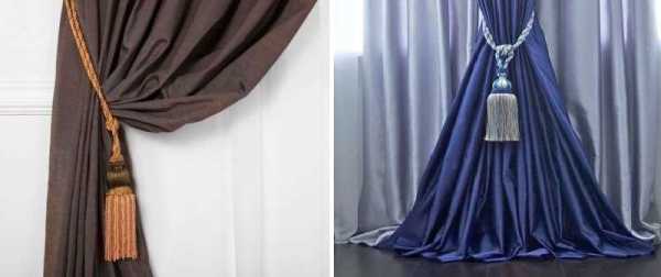 Разноцветные витые шнуры с кистями ― благородное статусное украшение. Особенно хорошо они смотрятся на изысканных элитных тканях: парче, бархате, велюре, плотном шелке. Задрапировать с их помощью тяжелую ткань просто ― достаточно перевязать ее словно поясом в нужном месте. Часто всего такие портьеры однотонные и насыщенного цвета, а шнуры оживляют их монотонность.