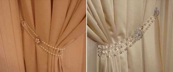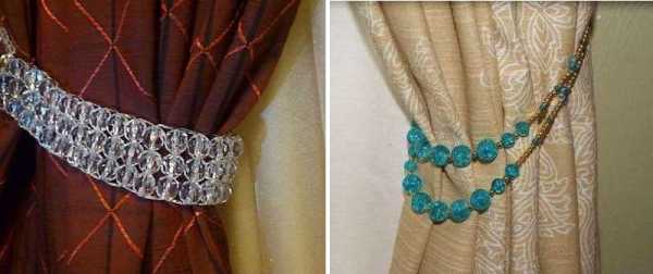 Подхваты для штор из бусин подойдут для однотонных или с бледным рисунком занавесок в спальне и гостиной. Они изысканно выглядят, создают камерную, умиротворяющую атмосферу. Для создания подхватов для штор из бусин можно взять уже готовую бижутерию или собрать их самостоятельно, используя не только бусинки, но и стразы, бисер, всевозможные декоративные цепочки, гармонирующие по текстуре и цвету с дизайном комнаты.