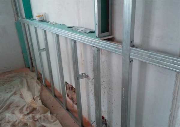Профиль крепится на стену строго по уровню. Наращивают каркас в соответствии с выбранной глубиной ниши. Металлическое сооружение обшивают нарезанным по заданным размерам материалом. Используют металлические, оптимальной глубины саморезы и шуруповерт.