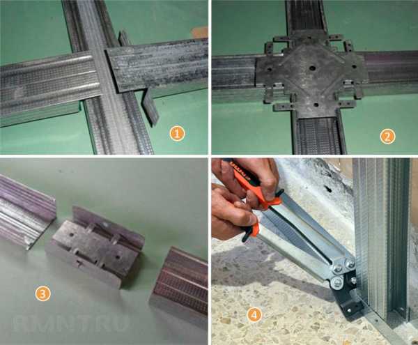 Варианты соединения профиля. 1. Соединение с помощью отогнутых «крыльев». 2. Использование соединительного «краба». 3. Специальная вставка для наращивания профиля. 4. Соединять профиль друг с другом лучше всего с помощью просекателя