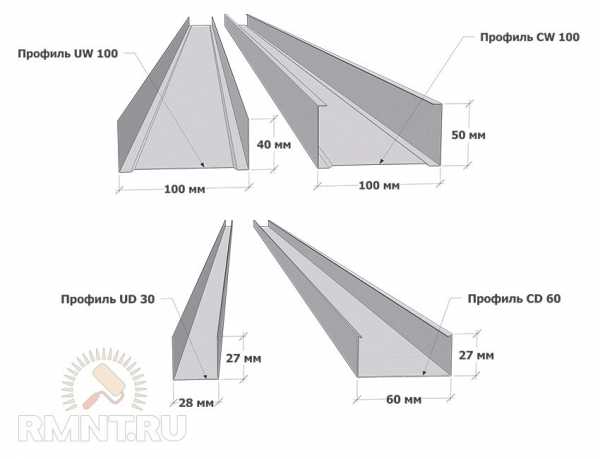 Основной набор профилей для создания каркаса практически любой формы. Профили CW и UW используются для формирования основы, CD и UD для усиления плоскостей, на которых будет крепиться гипсокартон