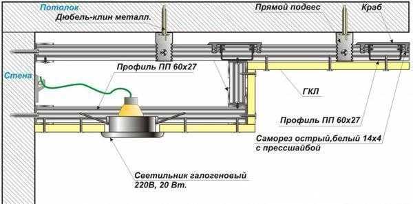 - При таком шаге основных профилей, необходимость несущих возникает только на поперечных стыках. Их шаг – 2,5м. Шаг подвесов, таким образом, будет 50см. Первый же ряд будет расположен на расстоянии в 25см от стены.