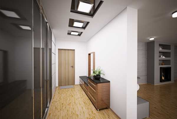 На железобетонное перекрытие встроенные светильники не смонтируешь, для этого потребуется подвесная конструкция. А несколько потолочных люстр в небольшой прихожей будут смотреться странно.