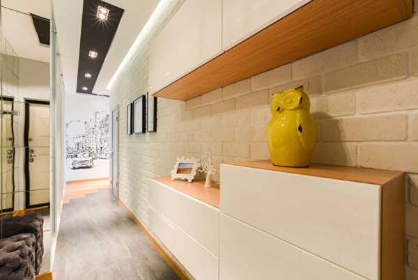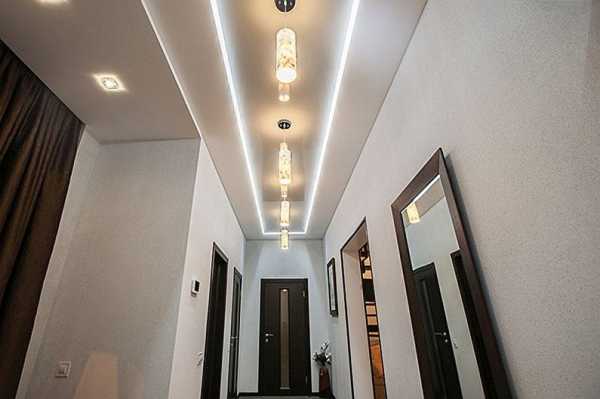 - Натяжной потолок. Небольшой коридор зрительно увеличится при помощи очень необычного совмещения двух вариантов отделки. Если совместить гипсокартонный потолок и натяжной, получится интересный вариант отделки с эффектом зонирования.
