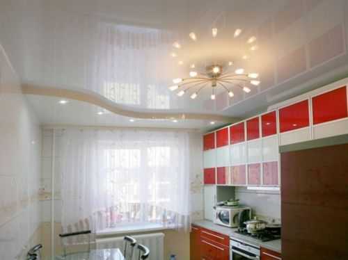 Особенный интерес представляют решения с двумя уровнями. Здесь появляется возможность скомбинировать две фактуры на разной высоте. Расположенный ниже уровень можно обтянуть матовым полотном, а более высокую часть – глянцевым. Такой прием создает ощущение очень высокого потолка и при этом, нет столь выраженных отражений в глянцевой поверхности. Чтобы убедиться в том, что натяжной потолок в два уровня на маленькой кухне может смотреться органично и его дизайн не «бьет» по глазам, посмотрите на фото пример, приведенный ниже.