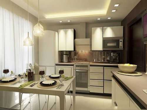 Свет также помогает расширить границы имеющегося помещения. Если его будет много, он способен убрать негативные ощущения от тесноты. Кроме того, расположив светильники в нужных местах, можно существенно увеличить комфортность пребывания даже в небольшом пространстве. На фото ниже показано, как можно расположить освещение на маленькой кухне с натяжным потолком.