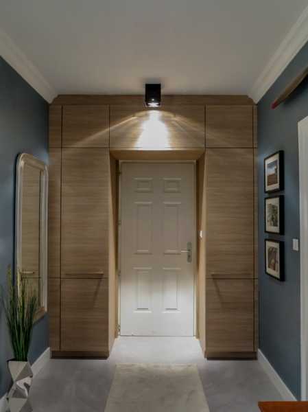 в узком коридоре решена проблема с пространством за счет встроенной у дверного проема двух пеналов с антресольными полками
