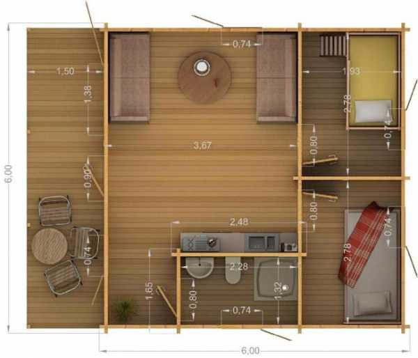 Рубрика: Проекты дачных домов |Предлагаю вниманию интересующихся загородным жильем компактный проект дома из бруса 6х6 метров для дачи. Общая площадь в 36 квадратных метров вполне комфортна для сезонного проживания, позволяет разместиться двум взрослым людям.