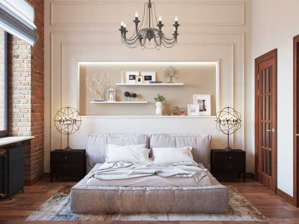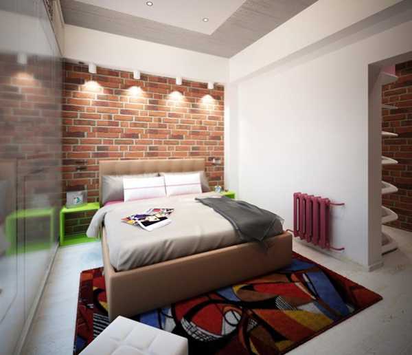 Сочные акценты (состаренная батарея, пестрый ковер, нестандартные прикроватные столики) наполняют спальню энергией.