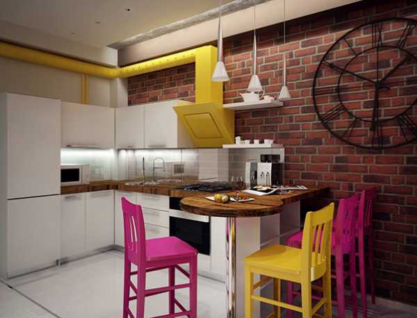 Кирпичная кладка и металлические конструкции воздуховода и вытяжки, выкрашенные в ярко желтый цвет, подчеркивают лофтовое направление дизайна интерьера.