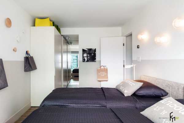 От минимализма данный стиль взял также компактность и функциональность. Например, телевизор, встроенный в шкаф.