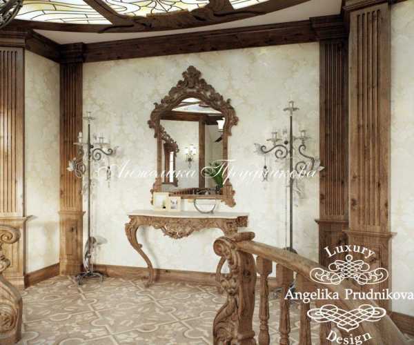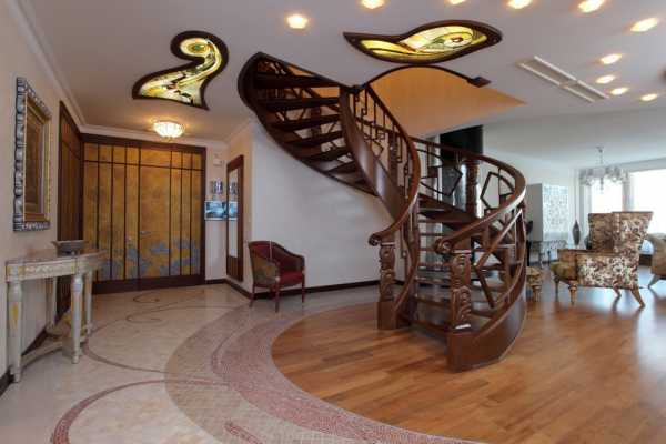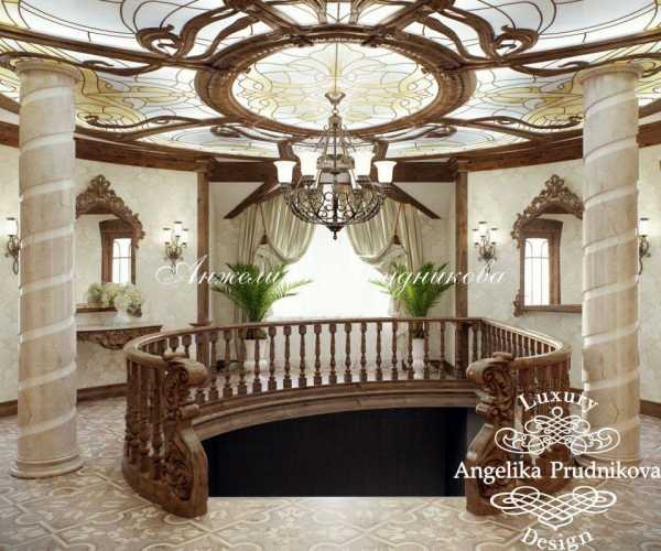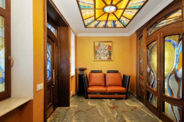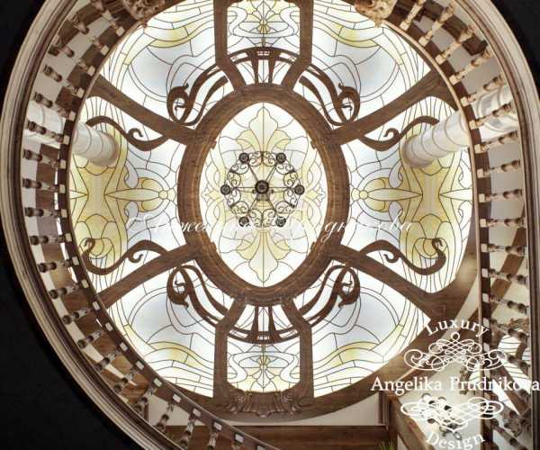 - На потолке большой прихожей витражи золотистых и древесных тонов – один круглый или вкрапления неправильной формы. Форму витражей повторяет обрамление из натурального дерева. В качестве узора – растительность.
