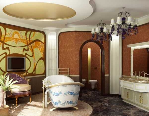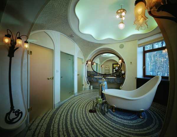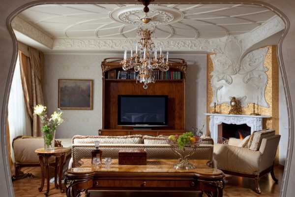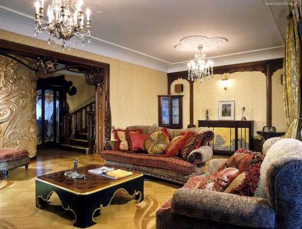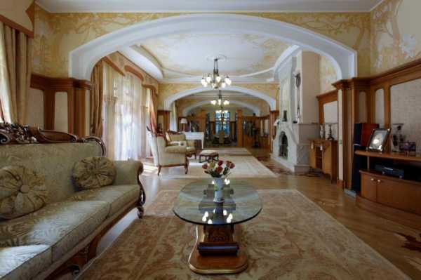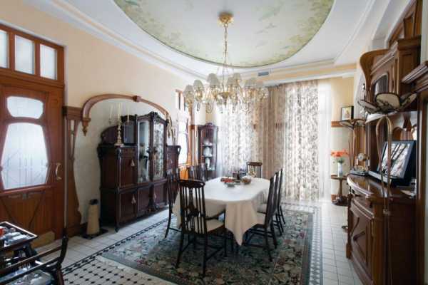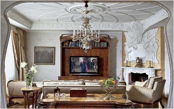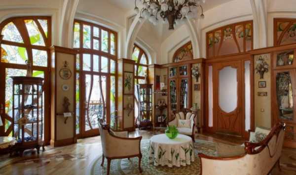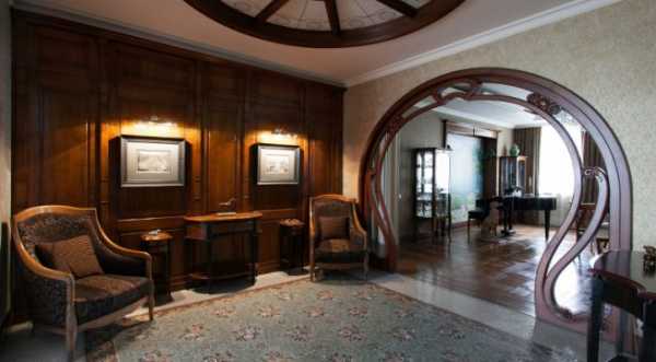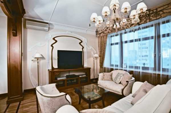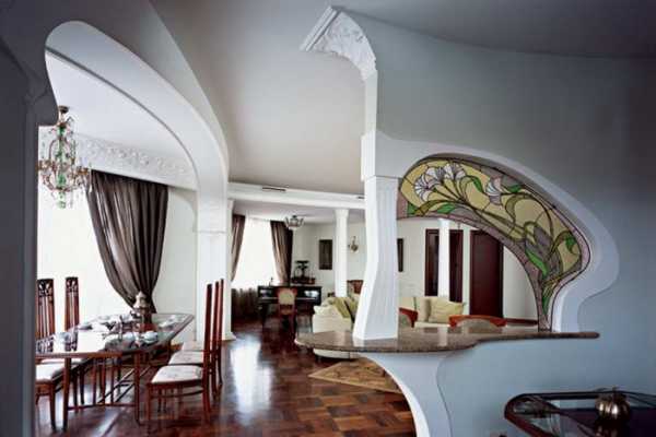Они не только смотрятся загадочно и по-старинному, вписываясь в современный интерьер, но и играют на контрасте со светлыми стенами. Современный мир отлично вписывает в интерьер гостиной в стиле модерн стеклянные перегородки, картины, столики, люстры, в ванной стилистические светильники и двери.