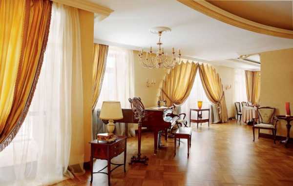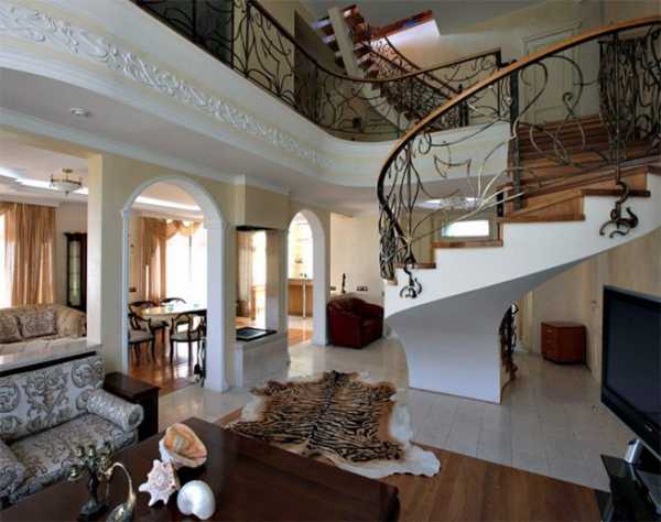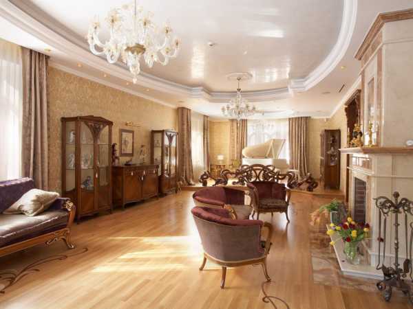 Что касается потолка, то эффектнее всего выглядит многоуровневый, сочетающий волны, плавные переходы и перекрытия. Углубления можно декорировать деревянными балками, выступы — лепниной.