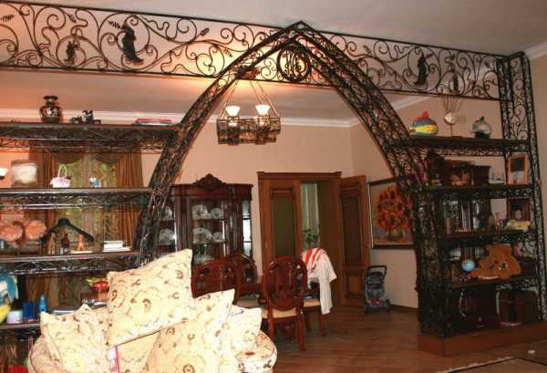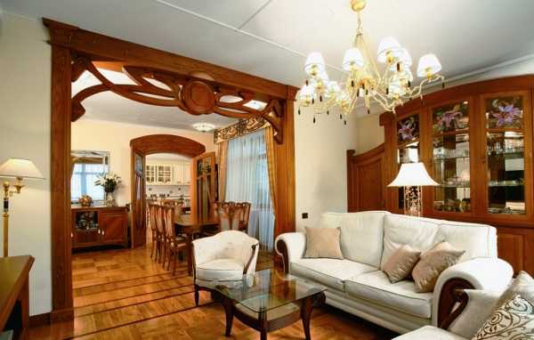 - Вместо обычной двери, ведущей в гостиную, арка с деревянной резьбой.