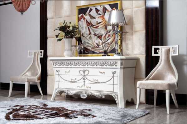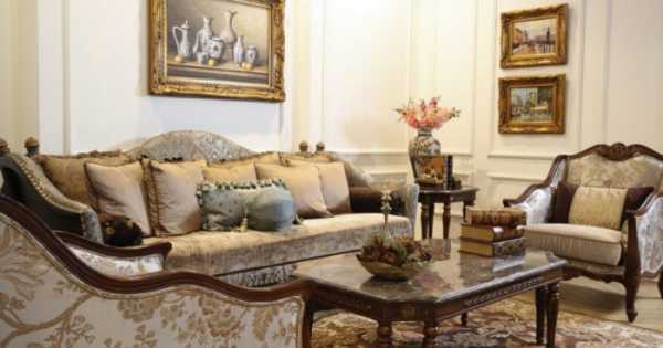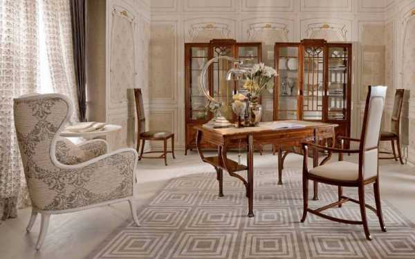 - Мебель с гладкими углами и резьбой. Обеденный стол можно накрыть светлой скатертью с растительным узором. Диваны и кресла светлых тонов с темными деревянными ножками, подлокотниками и окантовкой спинки.
