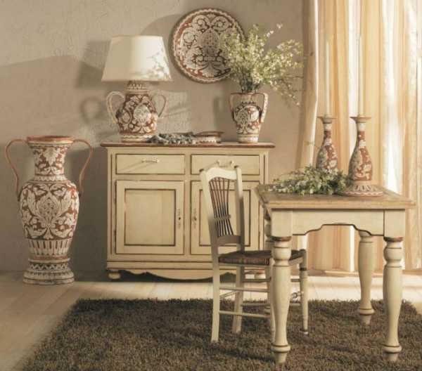 Для кухни будет достаточно нескольких расписных блюд, уместны также картины, панно, иногда шторы, состаренные люстры, подставки для кухонного инвентаря.
