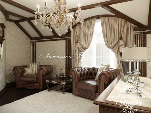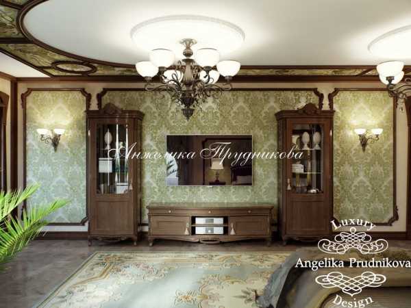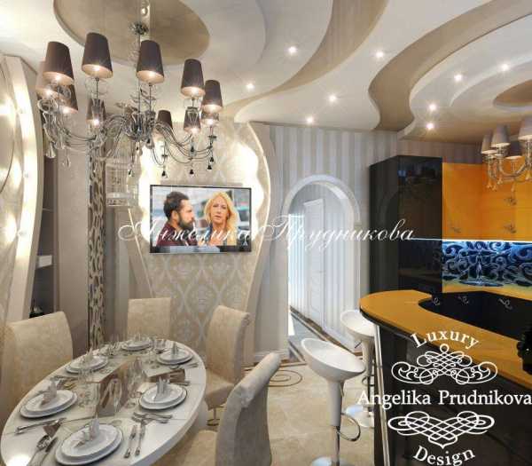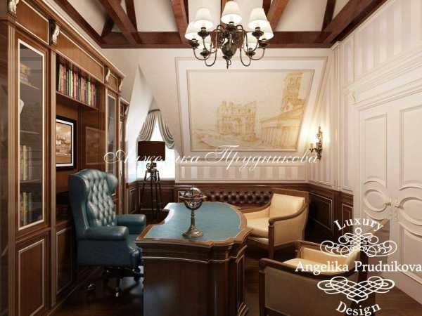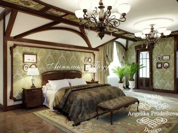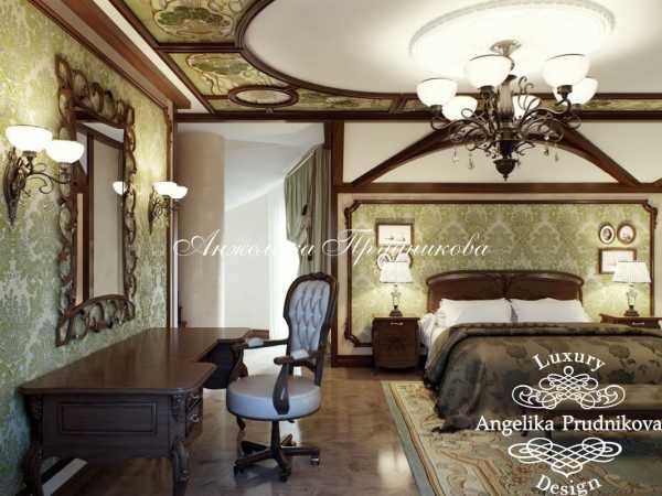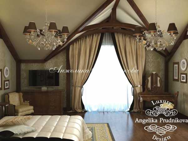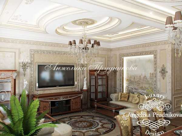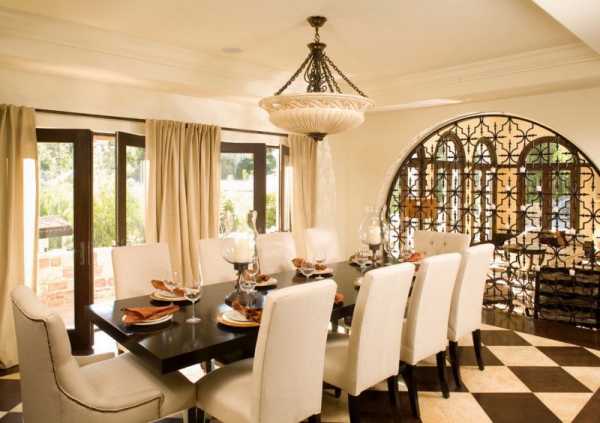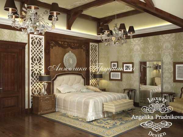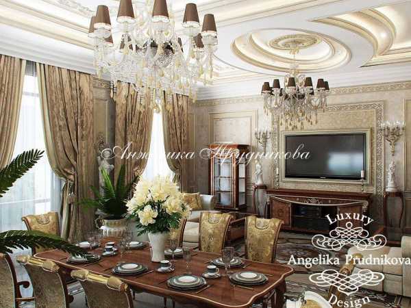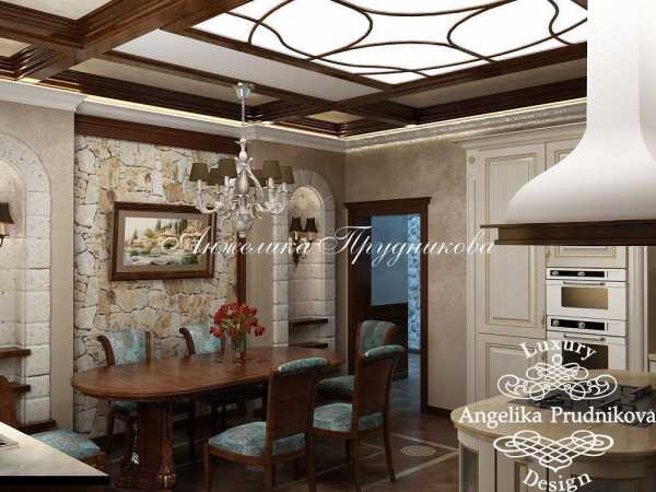 Среди интересных решений, которые можно встретить в работах многих дизайнеров, применение лепнины, подбор изысканной потолочной люстры. Отличный вид имеет и потолок, при декорировании которого применяются темные деревянные балки, а для оформления дверных проемов выбраны светлые тона.