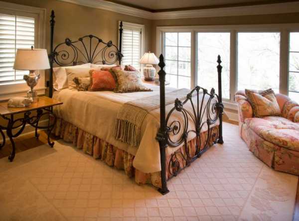 Дизайн спальни не стоит перегружать металлическими деталями. Хотя иногда выкованное изголовье и каркас кровати придаёт дизайну спальни особую роскошь. Полностью металлические двери в стиль модерн не впишутся.