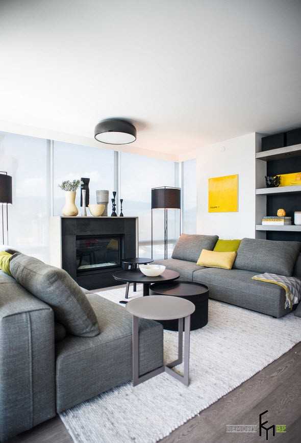 В гостиной диваны занимают центральную позицию, все должно располагать к отдыху и комфорту. Несколько мобильных столиков в тон остальной мебели, искусственный камин и мягкий ковер – все это прекрасно характеризует современный стиль.