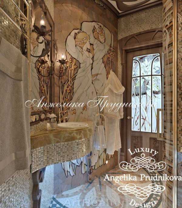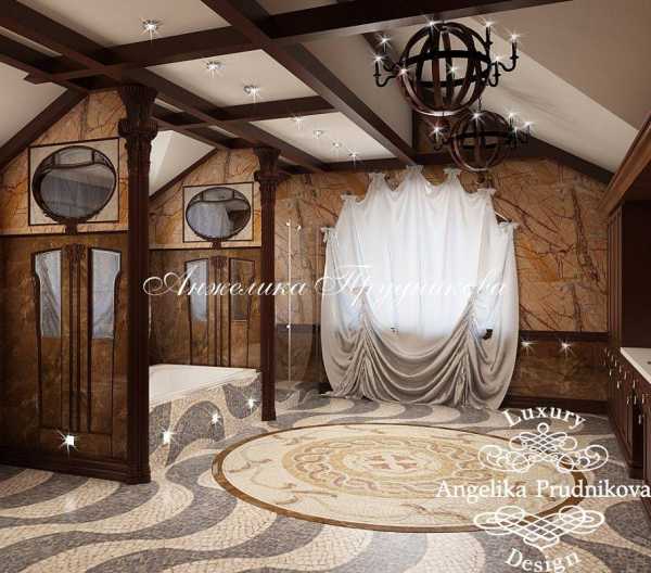 - Преобладает цветовая гамма белая, золотистая, древесная. Вертикальные поверхности можно оштукатурить – золотистая штукатурка с росписью более темного цвета. Потолок белый, но по периметру нанесена золотистая роспись.