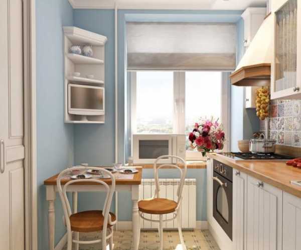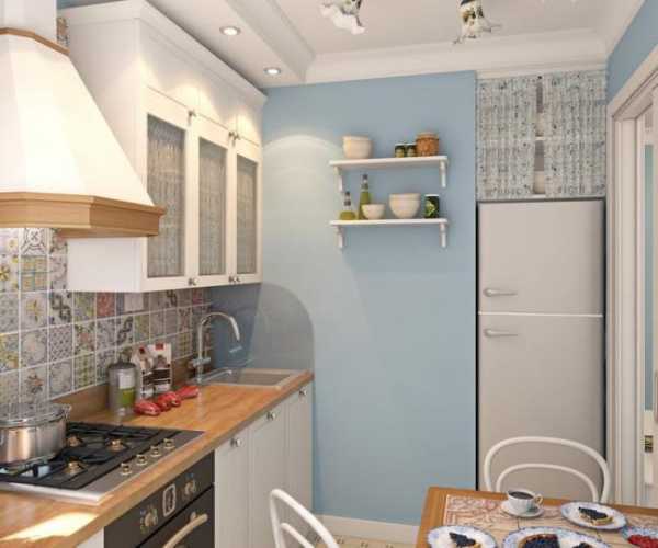 На представленных фото ремонта в хрущевке, кухня, как мы уже отмечали, осталась отделена от жилой комнаты. При покраске использовался голубоватый оттенок, который действует успокаивающе. Рабочая зона кухню отделана кафельной плиткой, причем все плитки имеют разные узоры, что создает достаточно милую и позитивную обстановку.