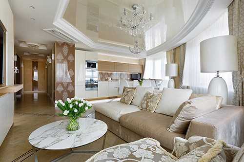 Интерьер гостиной в бежевых тонах тоже имеет ряд преимуществ — светлые природные оттенки способствуют умиротворению и спокойствию, они создают свою особенную атмосферу уюта. Яркие цветовые акценты добавят интерьеру динамичности.